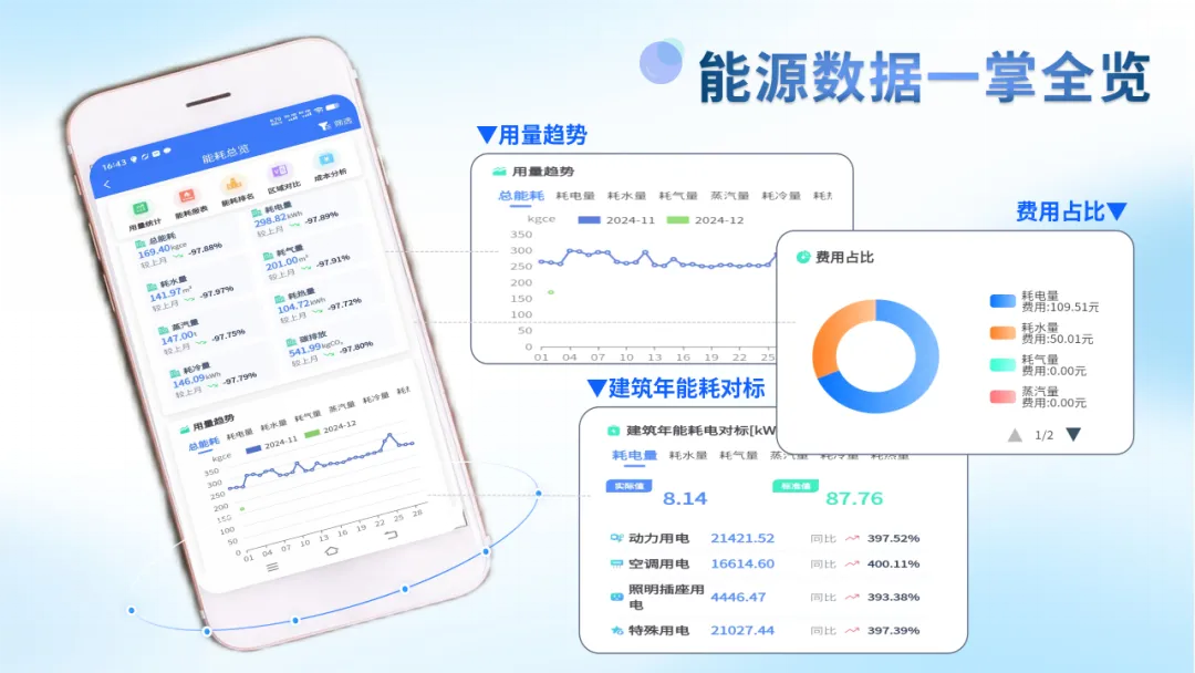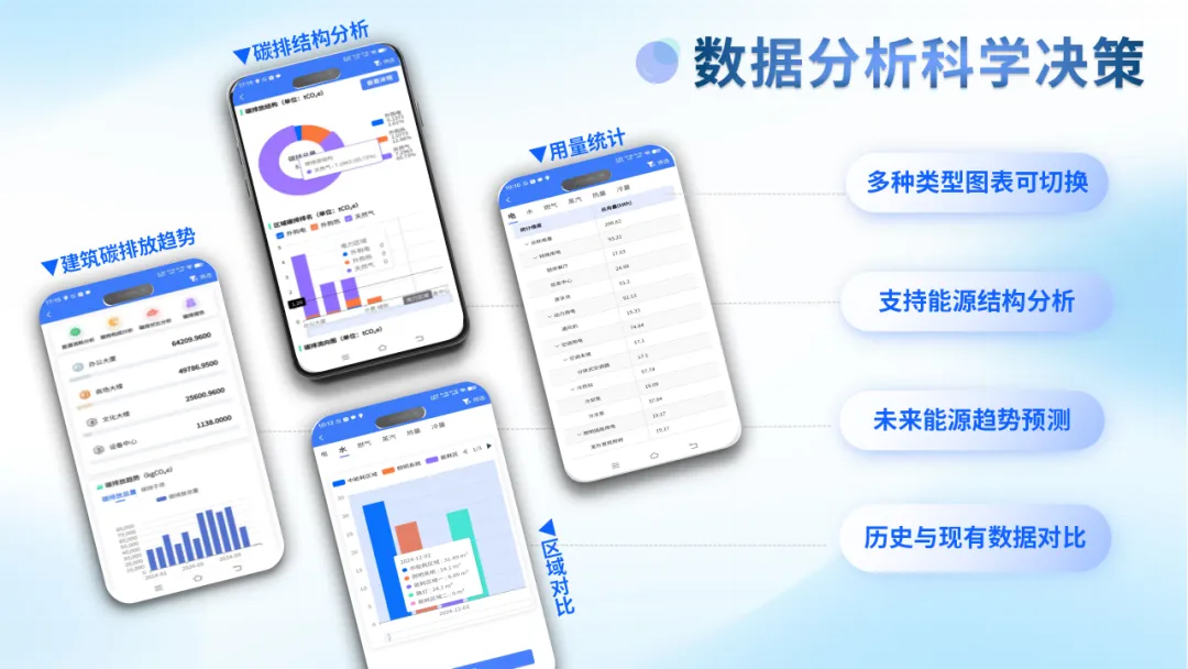 提供用量统计、能耗排名、区域对比、成本分析等多维度数据分析,利用大数据挖掘节能潜力,为制定节能决策提供科学依据。