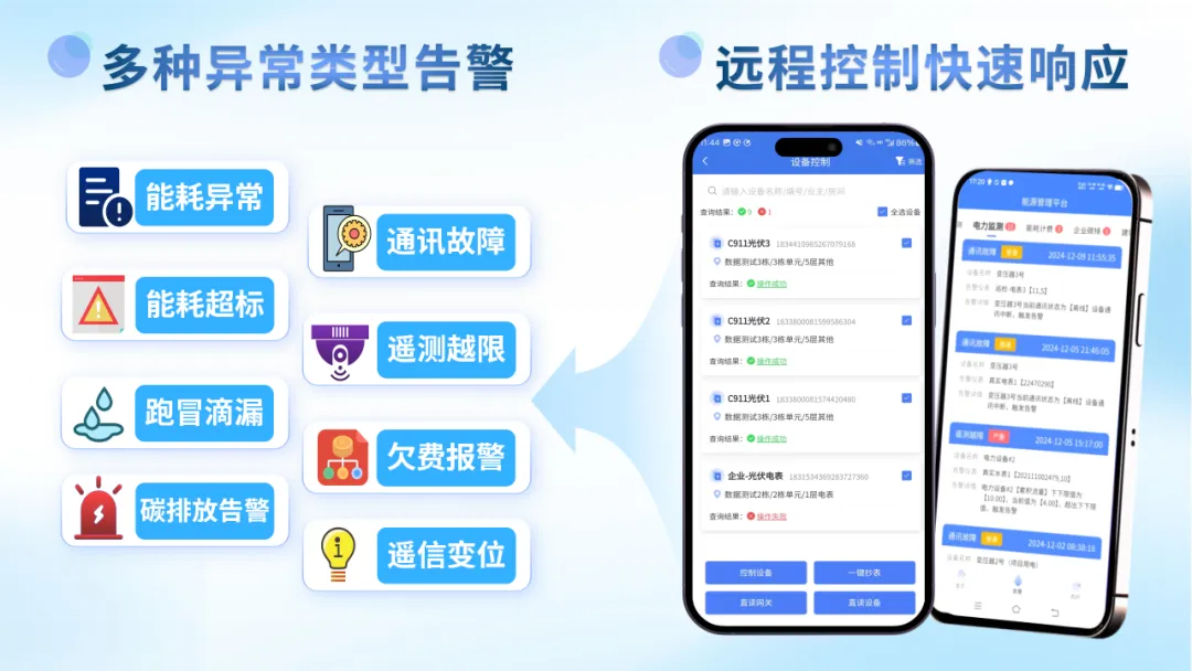 智能识别设备异常,及时发出告警信息,帮助用户迅速定位并解决问题,有效避免能源浪费,保障设备高效、安全运行。